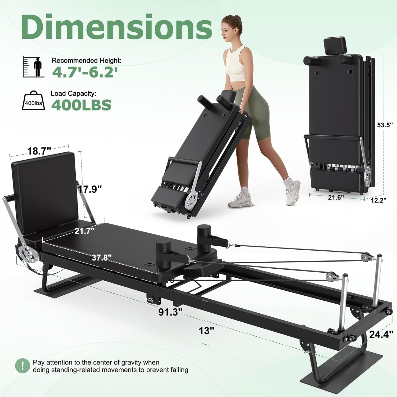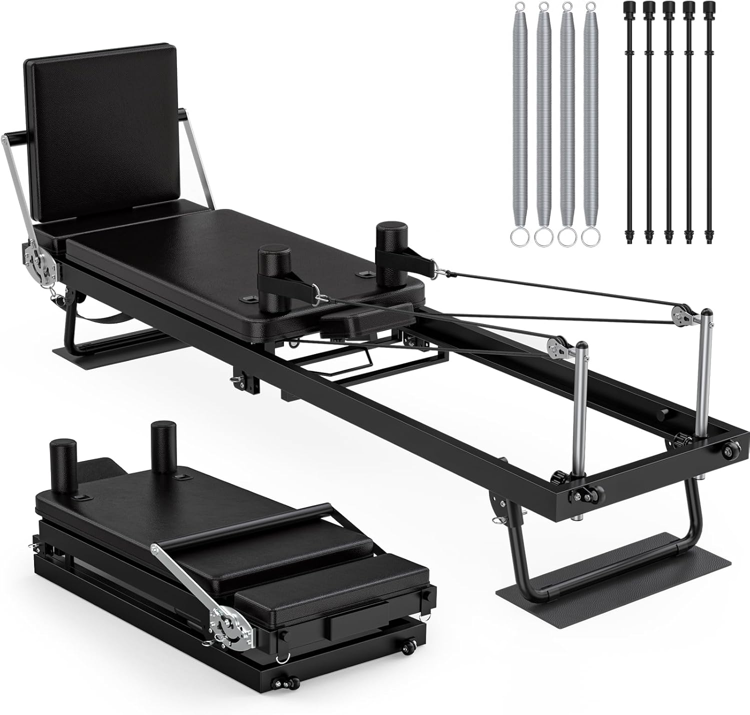 - [Build Your Home Gym] This compact foldable pilates machine takes up only 1.8 sq. ft when folded, perfect for limited space in apartments, bedrooms or living rooms. Built-in wheels make it easy to transport to any corner for storage